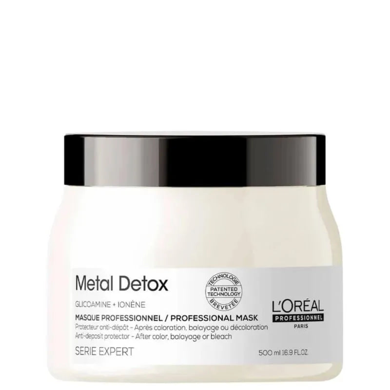 L’Oréal Professionnel Metal Detox Máscara Capilar 500ml é uma máscara de cuidado intensivo projetada para neutralizar e remover metais pesados do cabelo, protegendo-o contra danos e preservando a cor. Ideal para cabelos coloridos e descoloridos, oferece hidratação profunda, melhora a textura e o brilho dos fios, e ajuda a prolongar a durabilidade da cor.